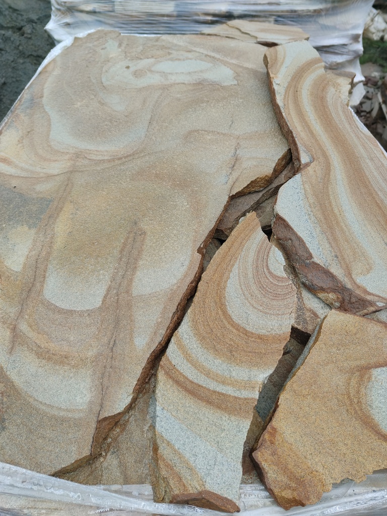 Песчаник жёлтый с разводами - для работ по облицовке стен, фундаментов, заборов.